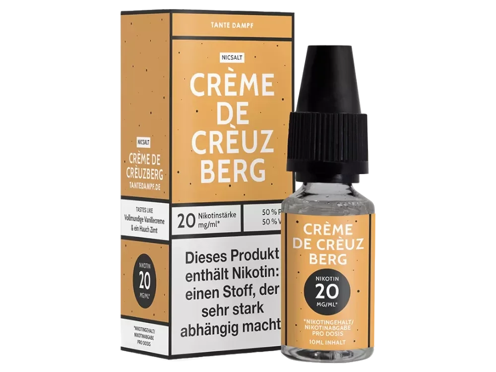 Insgesamt erhalten Sie 10 ml des Tante Dampf Crème de Crèuzberg Nikotinsalz Liquids. Diese befinden sich in einer 10 ml Flasche mit einer Nikotinstärke von 20 mg/ml. Das Nikotinsalz weist den Geschmack einer Vanillecreme mit einer Nuance Zimt auf und kann direkt verwendet werden.