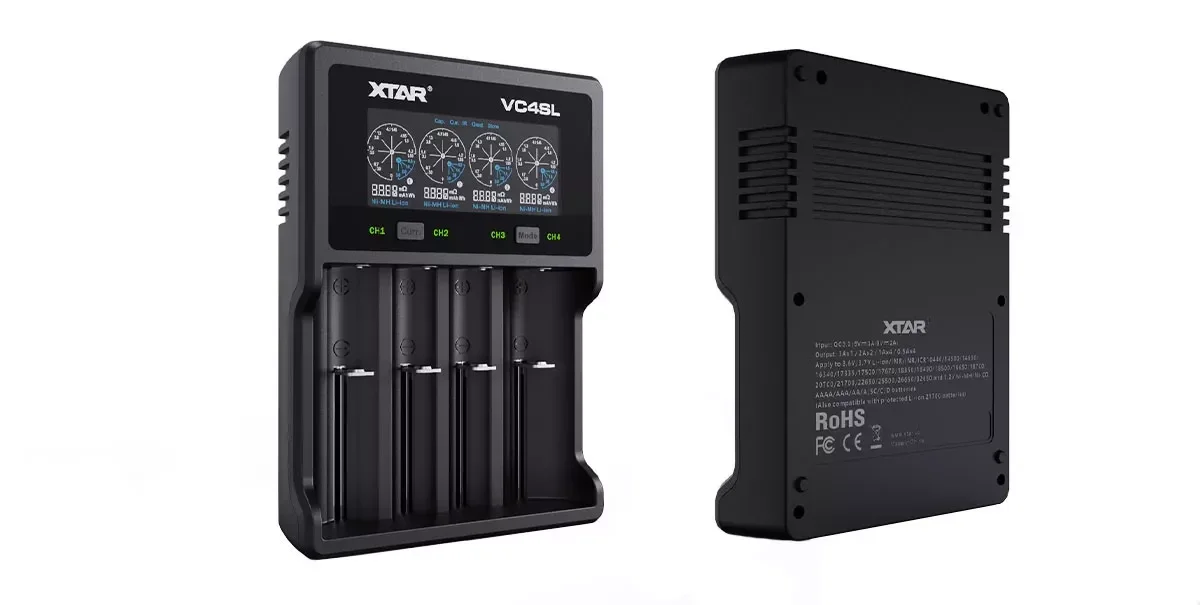 Das Xtar VC4SL Ladegerät kann bis zu vier Akkuzellen gleichzeitig laden. In das Ladegerät passen alle gängigen Li-Ionen Akkuzellen bis zu einer Größe von 32650. Es ist mit einer eingelegten Akkuzelle möglich, diese über Fast Charge mit bis zu 3 Ampere zu laden. Verwenden Sie alle vier Schächte gleichzeitig, haben Sie die Möglichkeit die Ladegeschwindigkeit zu regeln. Die Ladegeschwindigkeit verdoppelt sich pro Tastendruck von 0,25A, 0,5A, 1A, 2A und 3 Ampere. Das Ladegerät wird via USB-C mit Strom versorgt. Bitte beachten Sie, dass ein geeigneter Netzstecker nicht im Lieferumfang enthalten ist. Xtar empfiehlt die Verwendung eines QC3.0 Netzsteckers um den vollen Funktionsumfang des Ladegeräts zu nutzen. Über ein LCD Farbdisplay wird Ihnen der aktuelle Ladestand sowie die bereits geladene Menge Strom in mAh angezeigt. Sobald die Ladeschlussspannung erreicht wurde, wird der Ladeschacht vom Stromkreis getrennt um ein Überladen der Zelle zu vermeiden. Das Gehäuse des Xtar VC4SL Ladegeräts ist aus feuerfestem ABS Material gefertigt.
