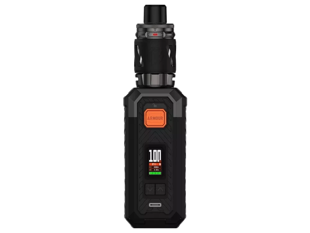 Beim Armour S E-Zigaretten-Set von Vaporesso trifft der gleichnamige Akkuträger mit einer Ausgangsleistung von bis zu 100 Watt auf den iTank 2 Verdampfer mit 5 Millilitern Tankvolumen, integriertem Top Filling-System, stufenlos regelbarer Airflow Control und einer Aufnahme für Verdampferköpfe im Plug and Pull Design. Bestandteil des Lieferumfangs sind zwei passende Verdampferköpfe aus der GTi Mesh-Serie von Vaporesso. Mit Widerständen von 0,2 bzw. 0,4 Ohm unterstützen beide Heads das subohme Vapen mit direkter Lungeninhalation. Die Armour S E-Zigarette kann in vier Ausgabemodi leistungsgeregelt oder temperaturgesteuert betrieben werden. Für die Inbetriebnahme des Devices wird eine wechselbare, hochstromfeste 21700er oder 18650er Akkuzelle benötigt. Bitte beachten Sie, dass diese nicht Bestandteil des Lieferumfangs ist, optional jedoch hier in unserem Shop erworben werden kann. Die Vaporesso Armour S wird klassisch über die Feuertaste in Kombination mit zwei Einstelltasten gesteuert. Dank ihres 0,96” TFT-Farbdisplays behalten Sie vorgenommene Einstellungen zu jeder Zeit im Blick. Mod und Verdampfer werden bei der Armour S durch ein standardisiertes 510er Gewinde miteinander verbunden. Sowohl der Akkuträger als auch der Tank werden durch ein spezielles TPU-Coating geschützt, wodurch das Gerät in besonderem Maße widerstandsfähig gegen Stürze und Stöße ist.